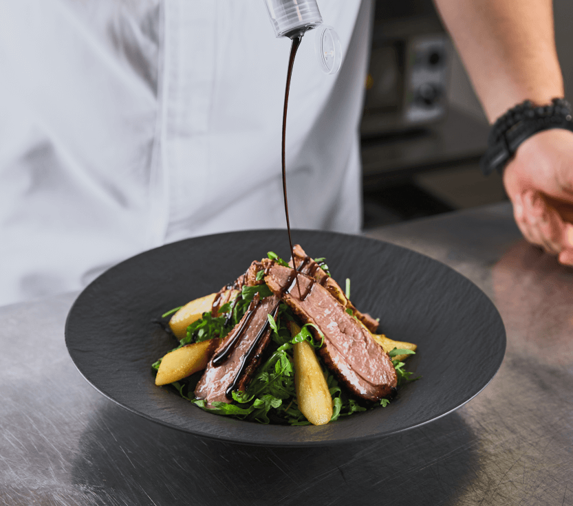 A composed seasonal entrée—wood-kissed proteins or vegetable-forward plates—letting the Warrior’s curation shine.